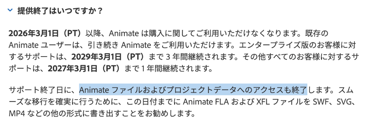 一方で、同じFAQ内で「サポート終了日に、Animateファイルおよびプロジェクトデータへのアクセスも終了」とも書かれています。