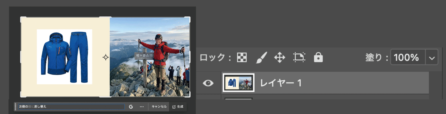 単に画面の横側に画像を配置し、画面全体を選択範囲とすれば参照可能になるので、プロンプトは「左側の服を」と指定すればよいです。